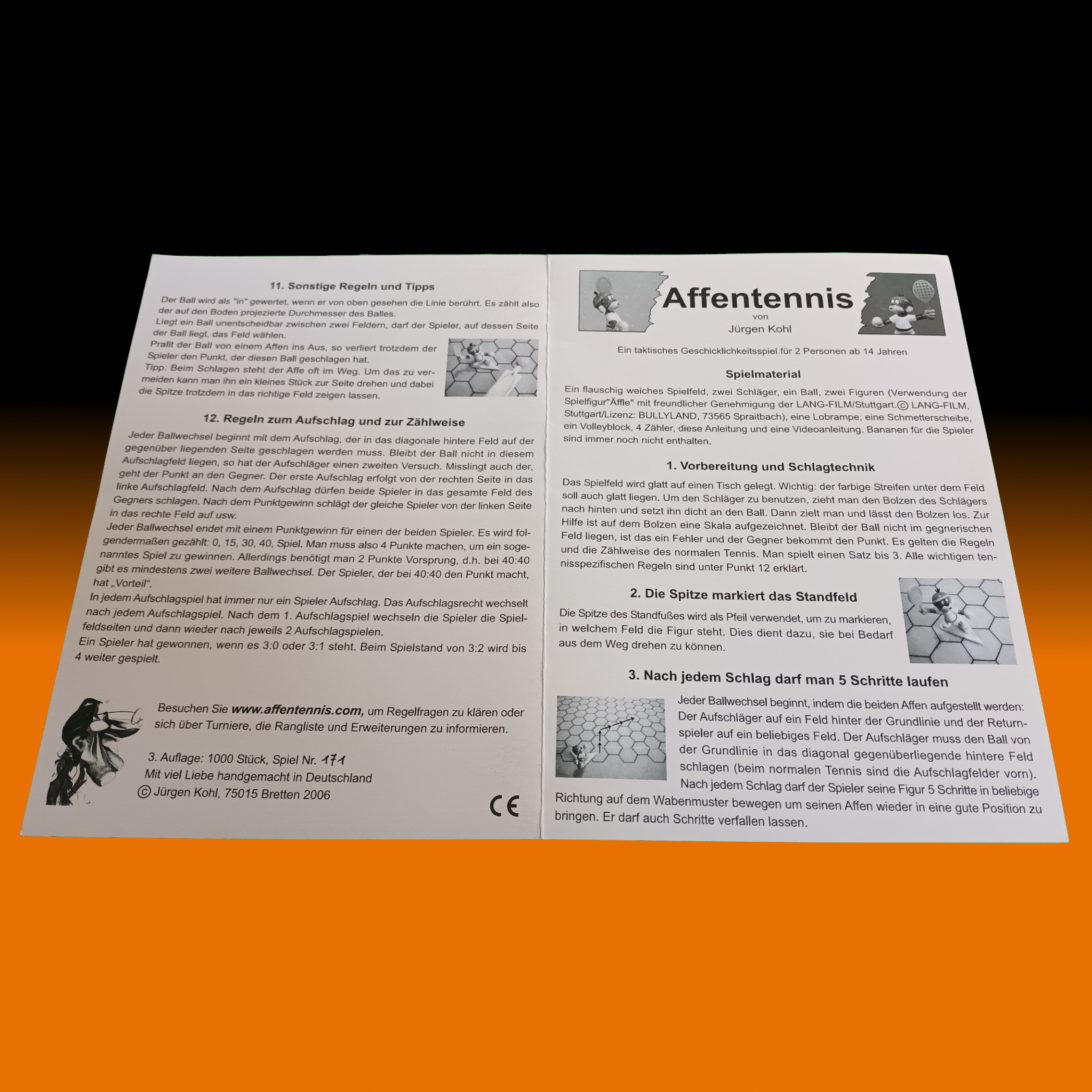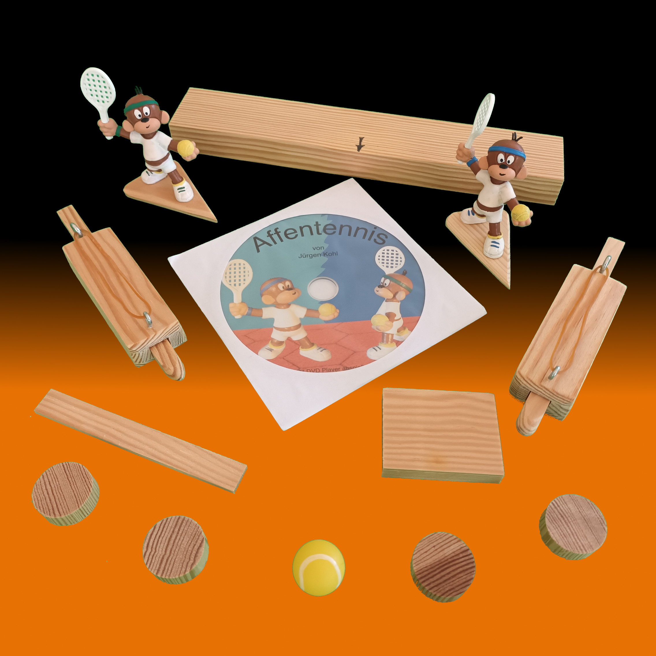Das Grundspiel Affentennis beinhaltet ein 120cm x 90cm großes Spielfeld, eine grüne und eine blaue Spielfigur sowie zwei Schläger und einen Ball. Zusätzlich gibt es einen Volleyblock, eine Lobrampe, einen Schmetterklotz und einen Ball. Um den Spielstand festzuhalten setzt man in der 3. Auflage vier Spielstandmarker auf die Anzeige auf dem Spielfeld. Auch hier ist eine Anleitung dabei und eine Anleitungs-CD mit Videoanleitung von mir. Das ganze ist in einem grünen Vliesbeutel verpackt.